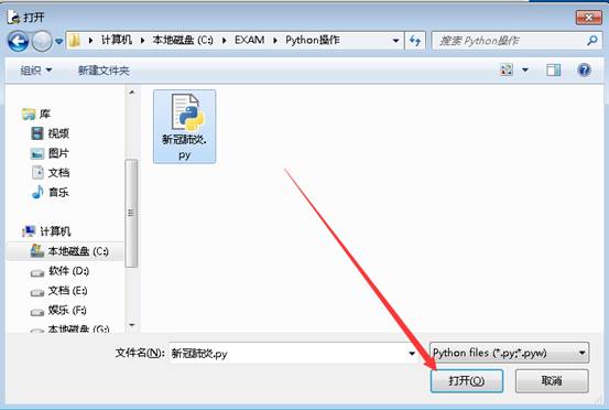 5.選中新冠肺炎.py,然后點(diǎn)擊箭頭處的打開(kāi)。